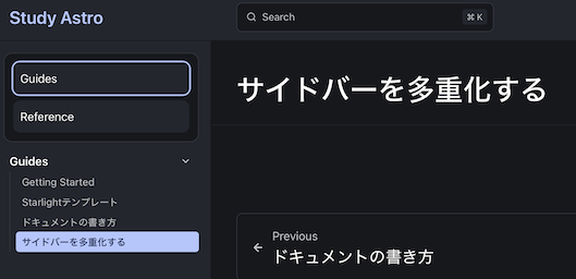 src/content/docs 以下のトップディレクトリごとに分割する。以下の例では guides と reference 以下のコンテンツがそれぞれ独立したサイドバーで表示されるようにする。